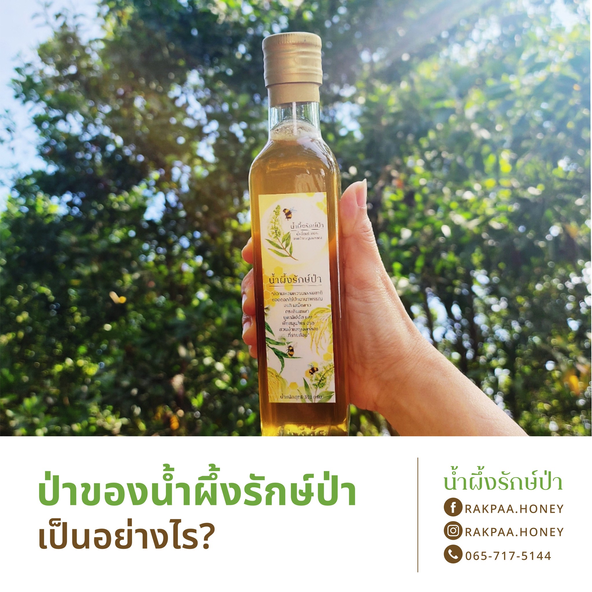 น้ำผึ้งรักษ์ป่า เกิดจากความรักป่า รักผึ้ง และรักผู้บริโภค จึงมุ่งมั่นสร้างสรรค์ป่าที่มีคุณประโยชน์ ให้ได้น้ำผึ้งแท้คุณภาพสูงจากธรรมชาติ โดยเสน่ห์ของน้ำผึ้งรักษ์ป่า คือรสชาติที่อร่อย หอม หวาน ละมุน และเปรี้ยวปลาย มีเลเยอร์ซับซ้อนอันเกิดจากความหลากหลายของดอกไม้ป่านานาพันธุ์ในพื้นที่ ทุกกระบวนการผลิตน้ำผึ้งจากธรรมชาติจึงมั่นใจได้เลยว่า ผึ้งผลิตในสภาพแวดล้อมที่อุดมสมบูรณ์ไปด้วยธรรมชาติที่เราช่วยกันดูแลร่วมกันกับชาวบ้าน